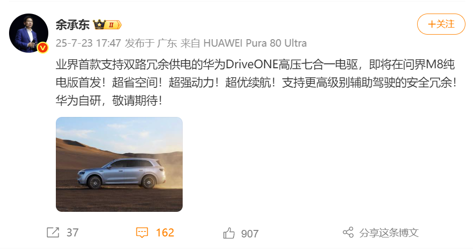 余承东:问界M8纯电版将首发华为自研电驱余承东:问界M8纯电版将首发华为自研电驱